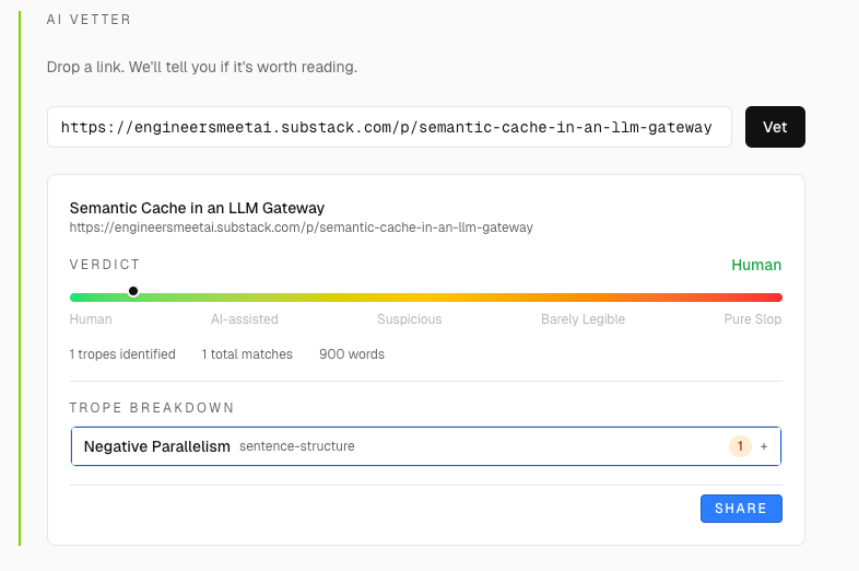 Tested my recent blog post using tropes.fyi AI Vetter.